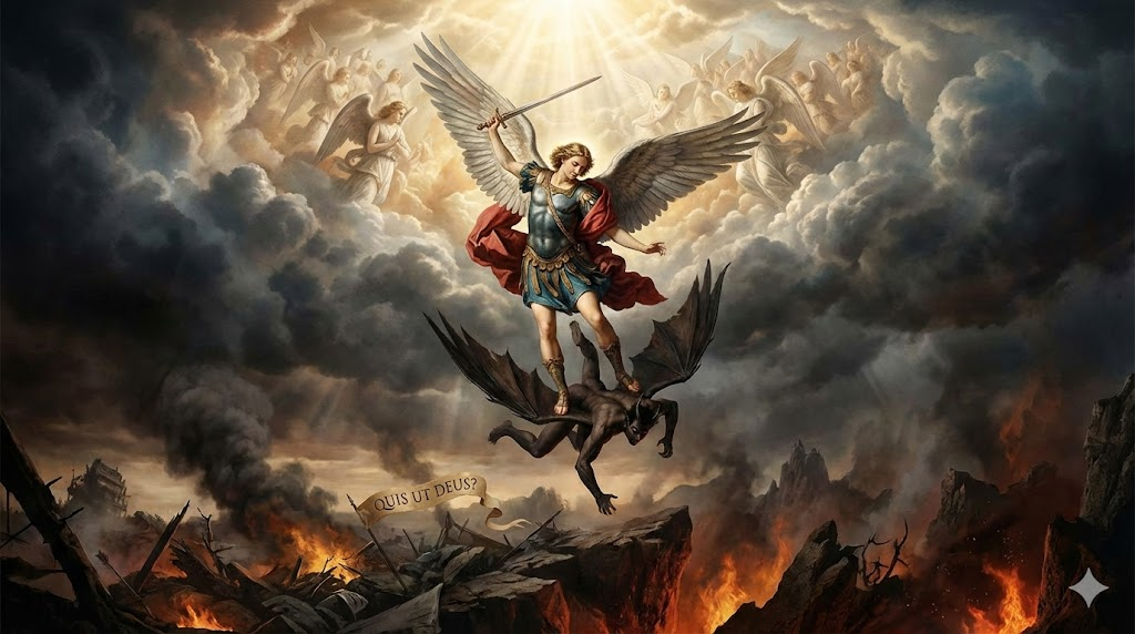 Nesta paisagem de ruínas interiores, a Igreja nos oferece um nome que corta o ar viciado do modernismo como uma lâmina de aço: SÃO MIGUEL ARCANJO.