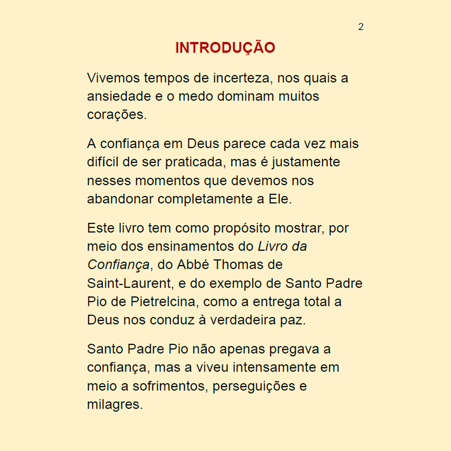 Este livro tem como propósito mostrar, por meio dos ensinamentos do Livro da Confiança, do Abbé Thomas de Saint-Laurent, e do exemplo de Santo Padre Pio de Pietrelcina, como a entrega total a Deus nos conduz à verdadeira paz.