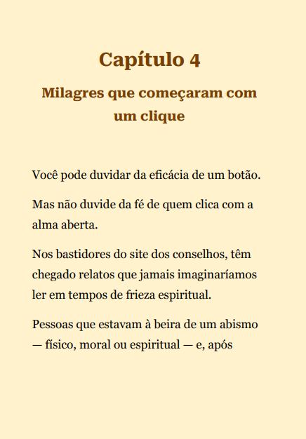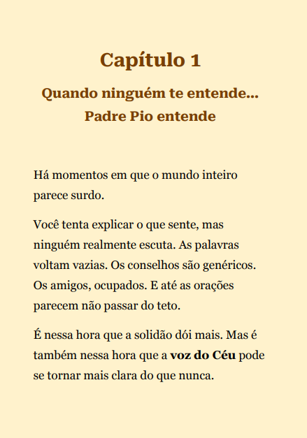 Padre Pio, marcado pelas chagas de Cristo, permanece em voz de firmeza e consolo.Este e-book reúne conselhos e testemunhos que ecoam de seu confessionário: duros contra o pecado, cheios de esperança para os aflitos e luz para quem busca direção espiritual.